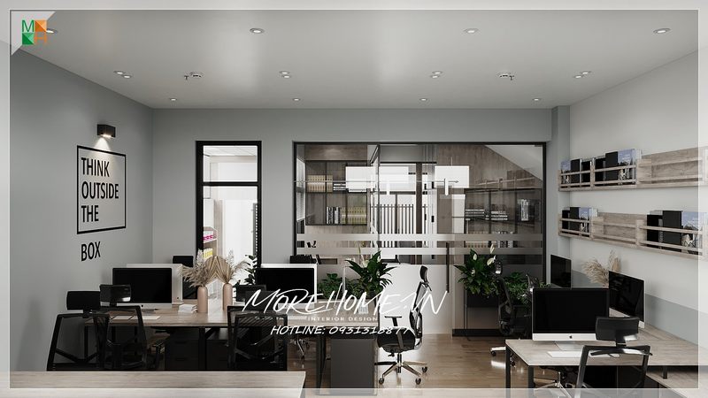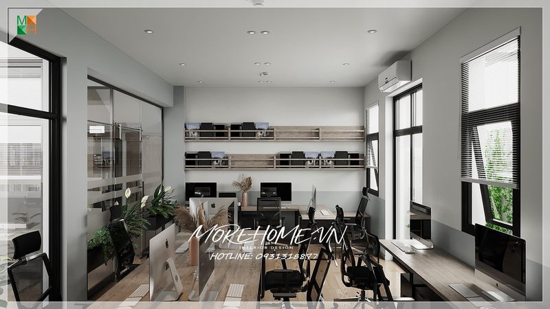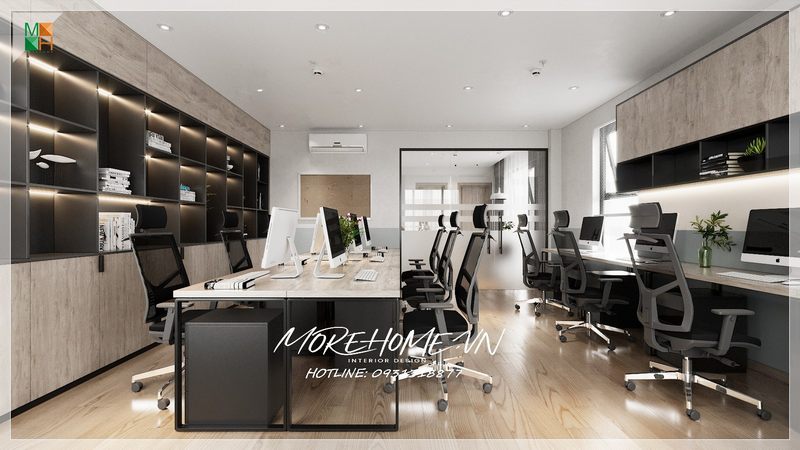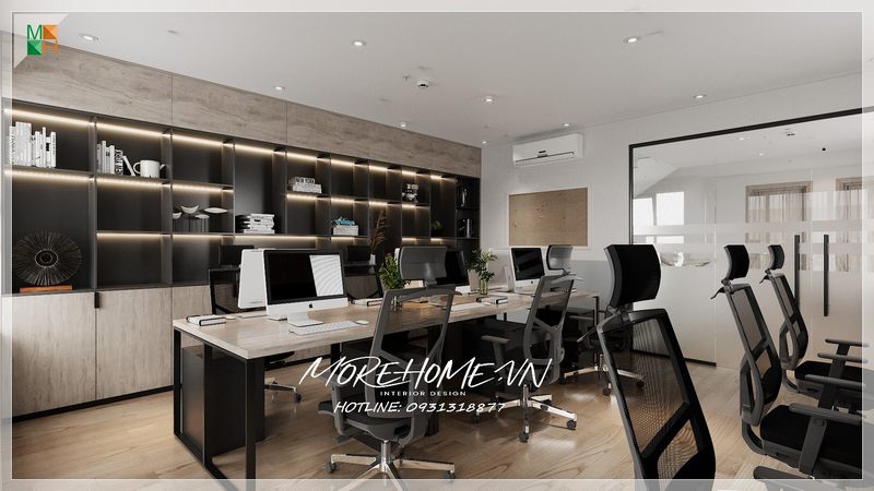 Bàn làm việc bằng gỗ có diện tích rộng với phong cách hiện đại mở đem lại sự thông thoáng cho nhân viên