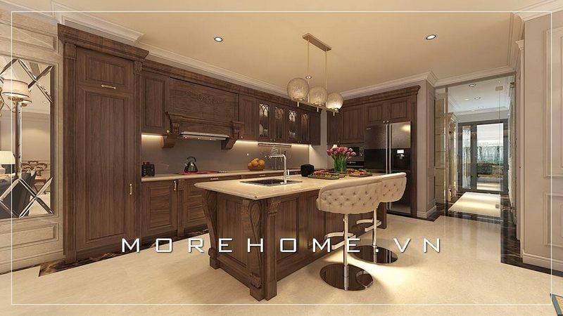 Bàn đảo bếp gỗ tự nhiên tân cổ điển, mặt bếp ốp đá màu vàng cao cấp tạo nên không gian phòng bếp sang trọng và tiện nghi