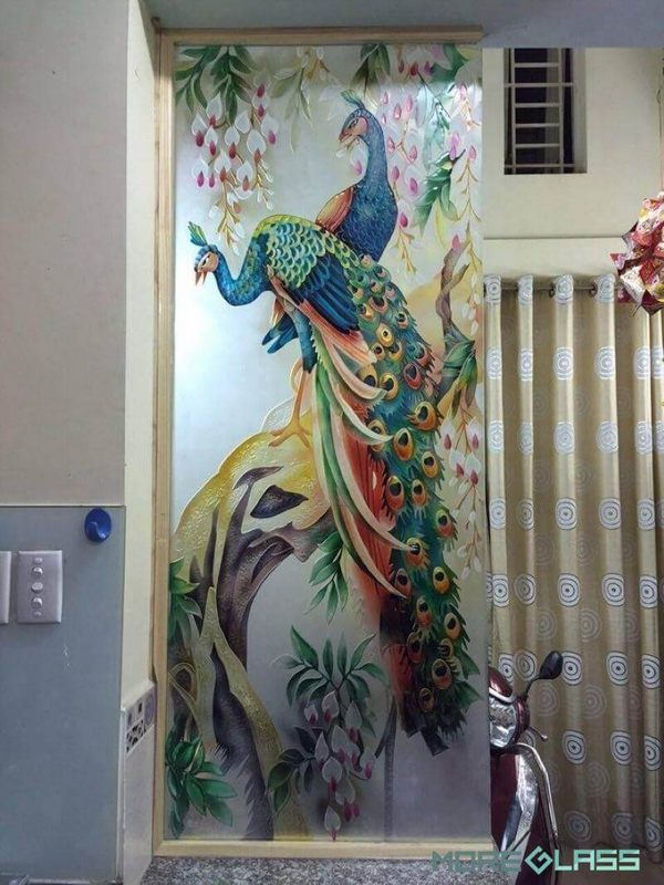 Thiết kế vách kính khắc 3D đôi chim công, với ý nghĩa trong phong thủy là biểu tượng cho sự quyền uy, giàu sang và phú quý