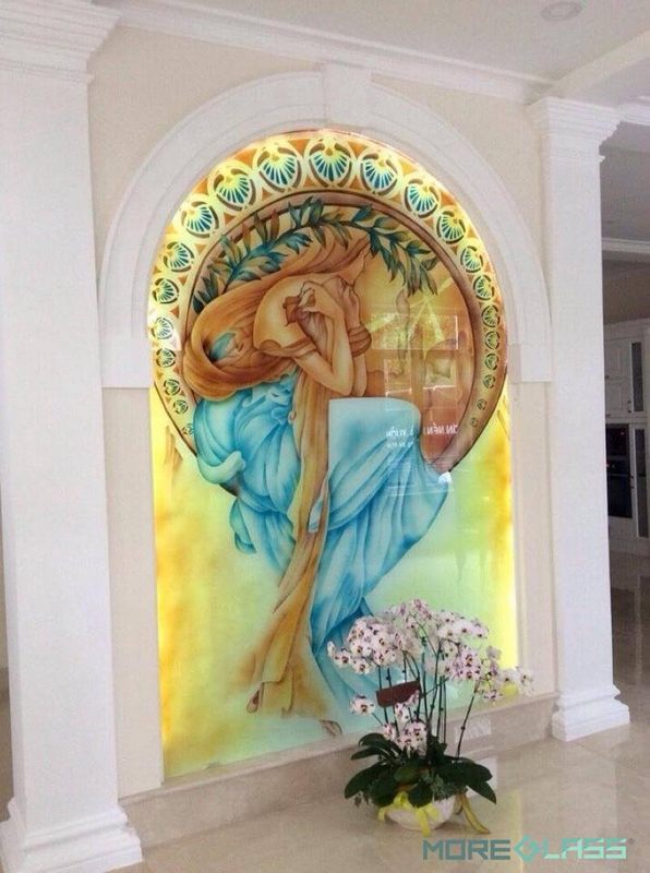Mẫu tranh kính điêu khắc phong cách châu âu cổ điển với những đường nét mềm mại hiện lên hình ảnh một người con gái tóc dài trong trang phục thời kỳ phục hưng, phù hợp cho biệt thự cao cấp phong cách cổ điển, tân cổ điển