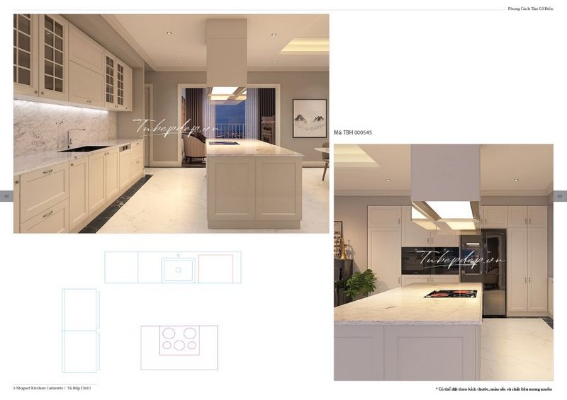 Mẫu thiết kế bếp chung cư, biệt thự, nhà phố theo phong cách hiện đại có chút tân cổ điển của tủ bếp, không quá cầu kỳ nhưng thiết kế rất phù hợp với không gian căn nhà. Thiết kế tủ bếp có chút tân cổ điển gọn gàng cả tủ dưới bếp và tủ bếp ở phía trên bếp nấu, tất cả đều ngăn nắp và rất tiện nghi.