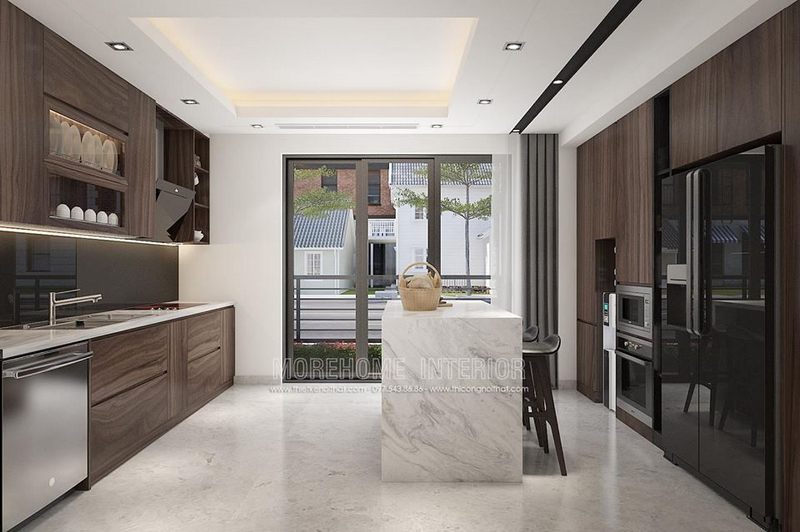 Tủ bếp chữ I gỗ công nghiệp hiện đại cung cấp một nguyên liệu và các vật dụng nấu ăn được đặt gần nhau, giúp người dùng sử dụng thuận tiện hơn.
